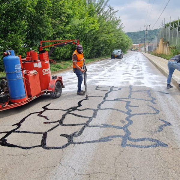 Posteriormente, se procede con la aplicación del sello de fisuras, el cual es producido con asfalto modificado con polímero para mejorar el desempeño. Este tratamiento se utiliza para fisuras de hasta veinte milímetros (20 mm) de espesor.
